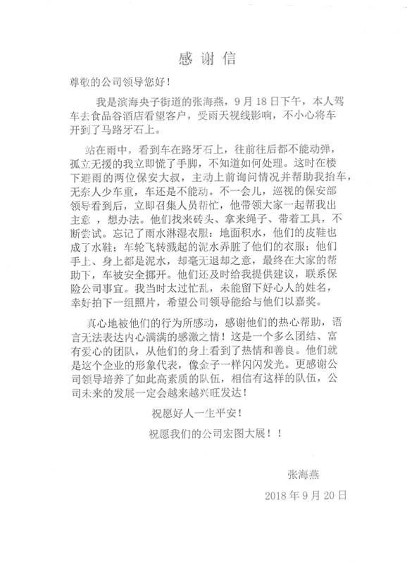 他們沒雪中送炭,他們沒錦上添花,他們只是做了應(yīng)該做的,又或許他們更懂得思考換位,他們是昌大公管下轄中國·濰坊食品谷的物業(yè)人。雖然小編時至一個月才拿到感謝信,還是想將這份溫情傳遞給每一位平凡崗位上的我們。 ......
